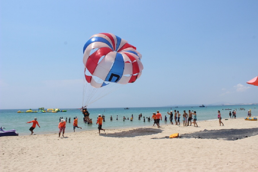 Du khách chụp ảnh, vui chơi tại bãi biển Hồng Vàn.